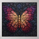 This vibrant poster features a stained-glass butterfly with glowing orange to magenta wings set in intricate dark leaded panels-colorful, elegant wall art with luminous detail. Finished as a mixed media art print.