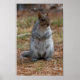 A grey squirrel stands alert on a bed of pine needles, with soft green and brown hues in the background. Its small, delicate paws are tucked close to its chest, and its bushy tail is visible behind.