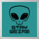 ilustracion de cabeza alienígena personalizado con grandes ojos oscuros con letras de "Stay Weird". Palabras clave: alienígena, espacial, marciana, personalizado, humor, vector, ciencia ficción, estadía, raro
