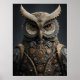 A commanding steampunk owl stares straight ahead, its face and body an intricate fusion of aged brass gears, riveted plates, and layered metallic feathers. Sharp mechanical ear tufts rise like horns above piercing golden eyes, while every detail of clockwork and plumage is rendered with Victorian precision against a moody dark background. This striking digital artwork blends nature and invention into a powerful portrait full of mystery and mechanical elegance, perfect for canvas prints, posters, phone cases, mousepads, throw pillows, and décor that adds bold steampunk character to any space.