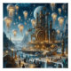 Una antigua ciudad futurista de vapor con medusas flotantes flotando en los cielos circundantes con agua fluida y luz de la luna incorporada al diseño.
