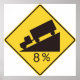Display a piece of functional road geometry with this poster featuring the 8 percent hill gradient warning sign. This detailed, high-quality graphic clearly depicts the yellow diamond symbol and the truck navigating the steep 8% slope. Perfect for decorating a garage, workshop, engineering firm office, or a truck driver's break room. This poster is a great educational piece and an appreciation of traffic control signage, ideal for collectors, safety professionals, or anyone interested in transportation logistics and the challenges of driving on steep grades.