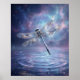 A delicate stellar dragonfly hovers above a luminous cosmic surface, its translucent wings shimmering with intricate starlight patterns and glowing filaments. The slender body radiates soft celestial light, creating an elegant and ethereal presence. Reflections ripple beneath it, surrounded by floating particles and subtle nebula tones. This refined artwork embodies lightness, precision, and beauty, making it ideal for modern decor, feminine interiors, and collectors of delicate, high-end cosmic-inspired designs.