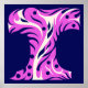This is a stylized graphic illustration of the capital letter T, filled with an abstract design composed of flowing purple and white shapes that suggest floral or organic forms. Black dots are scattered throughout the letter's interior. The letter is set against a solid dark blue background. The overall style is modern and decorative, transforming a simple letterform into an ornamental and visually engaging design. The use of bold colors and flowing lines creates a dynamic and eye-catching image.