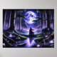 Un chica solitario se alza bajo una luna brillante, rodeado por un bosque brillante y un arroyo plateado. El aura mágica se amplifica con cristales brillantes y una luz de las estrellas brillantes en su vestido flotante.