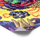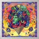 Un ilustracion surrealista y vibrante con la cara de una mujer. Su cabello está adornado con hongos, flores y otros elementos naturales, mientras que su cara está rodeada de patrones, ojos y burbujas que giran.
