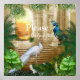 Boda de pavo real blanco y azul-verde en un templo tropical rodeado de vegetación para un diseño boda o decorativo