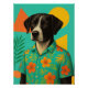 Meet the coolest canine on vacation. This delightful portrait features a distinguished dog sporting a turquoise aloha shirt with vibrant floral patterns. Bold geometric shapes and tropical colors create a retro-modern aesthetic that's both sophisticated and playful. The expressive eyes and detailed styling make this more than just pet art—it's a statement piece celebrating personality and joy.