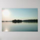 The sun rises over a serene lake, casting reflections on the still water. In the distance, small islands and forested land create a tranquil scene.