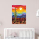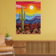 Este vibrante paisaje desértico ilustra un majestuoso cactus de saguaro contra un dramático cielo arco iris. Este moderno arte mural del suroeste capta la belleza del paisaje del desierto de Arizona con montañas moradas, flora desértica y un sol dorado, perfecto para la decoración del hogar, espacios de oficina o como un regalo único para los amantes de la naturaleza del desierto.