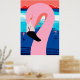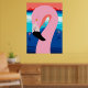 A digitally created artwork of flamingos watching the sun set behind the mountains in the background.