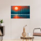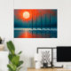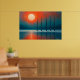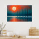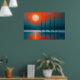 Tall trees stand silhouetted against a vibrant sunset, their reflections mirrored in the tranquil water below. The strong contrast between the warm sun and the cool blue tones creates a striking visual effect.