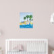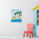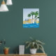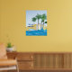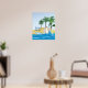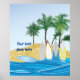 Rodeado de una playa tropical con palmeras de huella poster, con un paisaje tropical. La arena y las olas azules están adornadas con palmeras y tablas de surf. Es una plantilla y puede agregar el texto o personalizar para cambiar la imagen, el texto, el tipo de letra, el color. Esquema de color: azul, verde, blanco, amarillo, bronceado