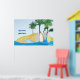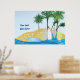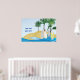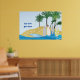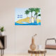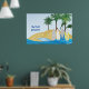 Rodeado de una playa tropical con palmeras de huella poster, con un paisaje tropical. La arena y las olas azules están adornadas con palmeras y tablas de surf. Es una plantilla y puede agregar el texto o personalizar para cambiar la imagen, el texto, el tipo de letra, el color. Esquema de color: azul, verde, blanco, amarillo, bronceado