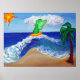 The painting is of a green angel on an orange surfboard catching a wave. A sun glows in the background and palm tree gently sways on the beach. The wave is getting ready to crash on the beach smoothing the sandy surface. The green angel pays tribute to the Archangel Raphael whose color is green and is known for bringing healing. The sun helps sustain life and through it plants such as palm trees strengthen and grow. The power of sun's energy is symbolized in the matched orange- yellow surfboard. The beach is clean and smooth.