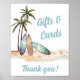 Pequeña ducha de regalo para bebés con temática de surf, señalización de caída con un ilustracion acuarela de playa tropical con palmeras, costas arenosas, pez estrella y vibrantes tablas de surf verde azuladas y marrones, y "Regalos y Tarjetas" y "¡Gracias!" en un divertido guión retro azul.