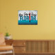 Nuevo diseño de surf en Smyrna Beach Florida. Una tabla de surf roja con texto azul y turquesa - tema de la tipografía surfista.