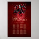 Susurros del corazón: La magia del amor y un pequeño gatito. Palabra estilizada LOVE se eleva majestuosamente en negrita, rojo, enmarcada por misteriosos contornos negros y floridos ornamentales que bailan alrededor de las letras como delicados tendrils. El fondo es de color rojo intenso, que recuerda a las bambalinas de un fuego deslumbrante, cálido y acogedor.