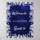 A welcome poster for a girly and glamorous Sweet 16 birthday party. A navy blue background with a white frame of white snowflakes. The blue color is uneven. Personalize and add a name. White letters. Perfect for a winter party.