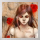 A picture displaying a anime/realism broken robotic doll, with colored stained Roses around her, Behind, a grungy stained light brown background Each person reads a different view from this picture