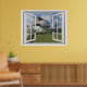 Poster con dinosaurio T-rex, escena falsa de ventanas, para una habitación sin ventanas o pared de oficinas. Divertido, realista poster óptico de ilusión para una oficina o pared de estudio.
