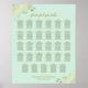 Este bonito cuadro de asientos boda presenta un diseño sencillo y elegante con texto dorado sobre un fondo verde claro o neonormenta. Hay adorables adornos de Relieve metalizado de imitación de oro o filigree floral en las esquinas y un título de caligrafía de escritura que dice "por favor, encuentren su mesa". El cuadro tiene capacidad para 290 personas en 29 mesas (10 asientos por mesa).