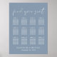 Moda polvoriento cuadro de boda descargable azul para hasta 12 mesas con "find your sit" en un guión blanco moderno, los números de la tabla y nombres de sus invitados con letras blancas simples y sus nombres y fechas bodas en una elegante tipografía de sari blanco. Puede seleccionar la opción de descarga digital para editar con cambios de último minuto e imprimir localmente.