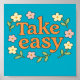 The image features the words "Take Easy" in a friendly, rounded, vibrant orange font with a darker outline, evoking a retro 1970s and 1980s style. Around the main text, a delicate bouquet of flowers in pastel shades of pink and light yellow, along with soft green leaves, adorns the composition, creating an organic and natural atmosphere. The light gray background provides a soft contrast that enhances the main elements without being overwhelming.