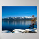 Una hermosa fotografía del invierno en el Lago Tahoe, con la línea recta de las montañas de Sierra Nevada reflejada en sus aguas cristalinas, rocas nevadas y un árbol solitario que forma el borde inferior.