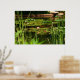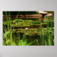 una escena serena con un estanque y plantas acuáticas, en un estilo de parrilla.