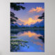A medida que el sol comienza a ponerse, la serena belleza de un lago tranquilo rodeado por un bosque verde y exuberante entra en escena. El paisaje se ve salpicado de flores blancas, lo que añade un ambiente tranquilo. A lo lejos, se puede ver una majestuosa cordillera con picos nevados, completando el paisaje impresionante.