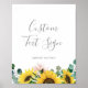Esta señal de texto personalizado de girasoles rústicos para tarjetas y regalos es perfecta para una boda campestre. El diseño floral bohemio presenta girasoles amarillos, flores rosadas y follaje de eucalipto verde cazador en acuarela con un elegante sentimiento boho moderno. ¡Personalice el texto para decir lo que quiera! Esta señal se puede utilizar para tarjetas y regalos, libro de invitados, hashtag de boda, favores, barra de postres, ¡cualquier cosa! Se puede utilizar para una boda, despedida de soltera, cena de ensayo o cualquier evento. La línea de texto en la parte inferior de la señal se puede personalizar con la fecha, los nombres de la novia y el novio, o un mensaje corto como "Gracias". Si desea varias señales coordinadas, personalice y agregue al carrito una a la vez.