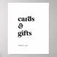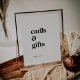 Esta señal moderna de tarjetas y regalos con tipografía negra es perfecta para una boda sencilla o una despedida de soltera. El diseño minimalista en negro y blanco presenta una fuente retro pero contemporánea con un toque rústico bohemio único. Perfecto para cualquier temporada. Manténgalo minimalista, tal como está, o agregue sus propios gráficos y obras de arte. La línea de texto en la parte inferior de la señal se puede personalizar con la fecha, los nombres de la novia y el novio, o un mensaje corto como "Gracias". Esta señal se puede utilizar para una boda o cualquier evento o fiesta.