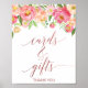 Esta señal de tarjetas y regalos de oro rosa con peonía rosa y durazno es perfecta para una boda elegante o una despedida de soltera. El diseño floral presenta un hermoso arreglo de peonías en acuarela en tonos de rosa y coral combinados con una delicada caligrafía con lámina de oro rosa falsa. La línea de texto en la parte inferior de la señal se puede personalizar con la fecha, los nombres de la novia y el novio, o un breve mensaje como "Gracias".