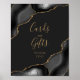 Un letrero elegante y sofisticado para agradecer a los invitados de la boda en su mesa de tarjetas y regalos. Las palabras "Tarjetas" y "Regalos" aparecen en caligrafía dorada, con "¡gracias!" debajo en letra serif. Diseños de ágata de acuarela negra recortados con brillo falso dorado enmarcan el mensaje en dos esquinas sobre un fondo negro mate. Vea nuestra colección para ver el conjunto de invitaciones de boda y papelería del día.
