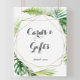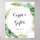 Esta señal de tarjetas y regalos de destino geométrico es perfecta para una boda tropical o una despedida de soltera. El diseño presenta hojas de palma verdes y hojas de plátano pintadas a mano con acuarela dispuestas cuidadosamente en hermosos ramos, adornando un marco geométrico dorado.