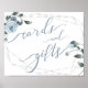 Dusty Blue Floral para hacer juego con el tema boda, infórmele a sus huéspedes dónde colocar sus tarjetas y regalos fácilmente con este signo coordinado. Rosas acuáticos, hojas y bayas en azul polvoriento de moda moderna rodean un marco plateado geométrico estilo terrario con vegetación de sabores. texto personalizar, estilo de fuente, color y tamaño. Obra de arte original creada para la BarefootBride™ por © WhimsicalArtwork™ - Esta es parte de una suite Boda Stationery con boda, ducha de bebé y otras papelería de eventos a juego.