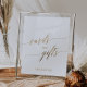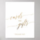 Esta elegante señal de tarjetas y regalos con caligrafía dorada es perfecta para una boda sencilla o una despedida de soltera. El diseño neutral presenta una señal minimalista decorada con tipografía romántica y caprichosa de lámina dorada falsa. La línea de texto en la parte inferior de la señal se puede personalizar con la fecha, los nombres de la novia y el novio, o un mensaje corto como "Gracias". Esta señal se puede utilizar para una boda o cualquier evento o fiesta.