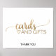 Esta sencilla señal de tarjetas y regalos de caligrafía dorada es perfecta para una boda chic. El diseño clásico romántico presenta tipografía de lámina dorada falsa y un hermoso corazón dorado. La línea de texto en la parte inferior de la señal se puede personalizar con la fecha, los nombres de la novia y el novio, o un breve mensaje como "Gracias".