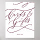 Esta tarjeta de caligrafía de texto de color burgundy romántico y cartel de regalos es perfecto para una boda simple o una ducha de novia. El diseño clásico moderno cuenta con giros elegantes y florituras caprichosas con tipografía elegante y escrita a mano. La línea de texto en la parte inferior del cartel se puede personalizar con la fecha, los nombres de la novia y el novio, o un mensaje corto como "Gracias". Este cartel se puede utilizar para una boda o cualquier evento o fiesta.