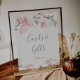 Esta señal de tarjetas y regalos de flor de cerezo de primavera es perfecta para una boda moderna o una despedida de soltera. El diseño floral oriental presenta una caprichosa rama de flor de cerezo en acuarela de color rosa y hojas verdes con un estilo japonés elegante. La línea de texto en la parte inferior de la señal se puede personalizar con la fecha, los nombres de la novia y el novio, o un mensaje corto como "Gracias". Esta señal se puede utilizar para una boda o cualquier evento o fiesta.