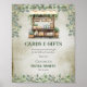 Hermoso diseño de cartel de "tarjetas y regalos" de mercado de agricultores de eucalipto verde salvia y bosque. El fondo frontal desgastado y rústico combinado con el puesto de madera lleno de vegetación y el eucalipto colgante circundante recuerda a un mercado italiano o rural al aire libre.