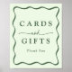 Añada un toque elegante a su boda, ducha de novia, ducha de bebé, fiesta de graduación u otro evento especial con este símbolo de regalo y tarjetas de marco ondulado verde moderno. El diseño presenta "Tarjetas y Regalos" con letras verdes en negrita rodeadas de un borde ondulado verde que contrasta con un fondo verde claro. Personalice el signo de las tarjetas retro y los regalos con el texto de su personalizado a continuación. Elija entre opciones profesionales de impresión o descarga instantánea, proporcionando flexibilidad para su comodidad.