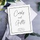 Esta es una elegante, minimalista y moderna tarjeta y letrero de mesa de regalos. Cuenta con un diseño simple y elegante que utiliza una tipografía sencilla y llamativa en negro y blanco clásico. Por favor, póngase en contacto con el diseñador para cualquier consulta o solicitud de variaciones en este diseño.