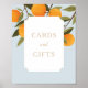 Muéstrele a los clientes de la ducha de bebé dónde dejar sus tarjetas y regalos con este elegante cartel, que incluye un elegante ilustracion de rama de naranja y tipografía de oro.