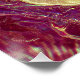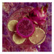Un tazón de vidrio cristalino contiene una pitahaya magenta cortada por la mitad que rebosa de semillas negras junto a pitahayas enteras y rodajas de limón brillantes, todo flotando sobre una superficie púrpura iridiscente hipnótica que ondula como cristal fundido. Colores tropicales saturados y reflejos surrealistas crean una naturaleza muerta moderna y audaz llena de energía exótica y textura brillante. Ideal para carteles llamativos, fundas de teléfono, pegatinas, tazas, arte para paredes de cocina, alfombrillas para ratón y decoración que aporta un toque fresco y psicodélico de color a cualquier espacio.