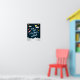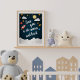 Adorable arte para la pared del cuarto de tu pequeño aventurero presenta la cita "te amo hasta la luna y de regreso" sobre un fondo azul marino de espacio exterior con estrellas, lunas, planetas, nubes y un cohete espacial.