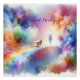 Ilustración en acuarela Te veré en el Puente del Arcoíris. Una escena caprichosa y soñadora que representa un colorido y etéreo Puente del Arcoíris que se extiende a través de un paisaje fantástico lleno de nubes suaves y onduladas en vibrantes tonos de azul, rosa y amarillo. La atmósfera es serena y mágica, evocando una sensación de asombro y tranquilidad, rodeada de estrellas brillantes y rastros de luz que realzan el encanto de la escena.