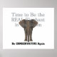 Es hora de ser el verdadero elefante en la habitación. Sé Conservador De Nuevo. Eslóganes políticos para la mente conservadora con un gran gráfico de un elefante que arrancar. Tees, posters, sudores y otros equipos políticos o de campaña de teepossible.com.