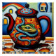 A.I. creó la impresión surrealista de un Panda asomándose a una tetera colorida, rodeada por un mosaico vibrante de formas geométricas, patrones de tonos audaces.